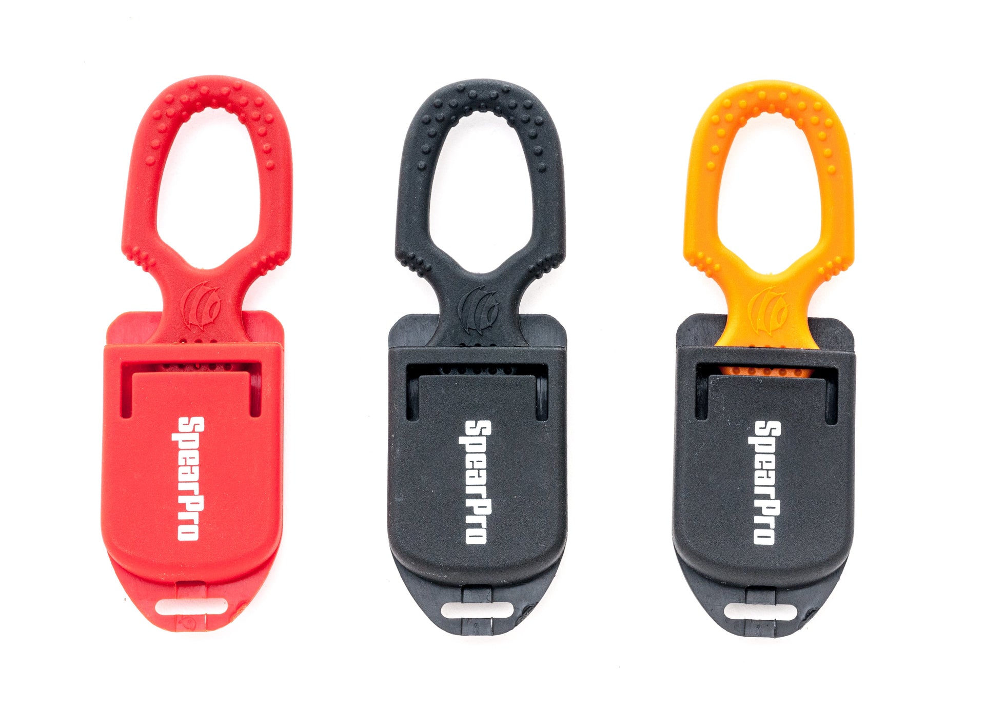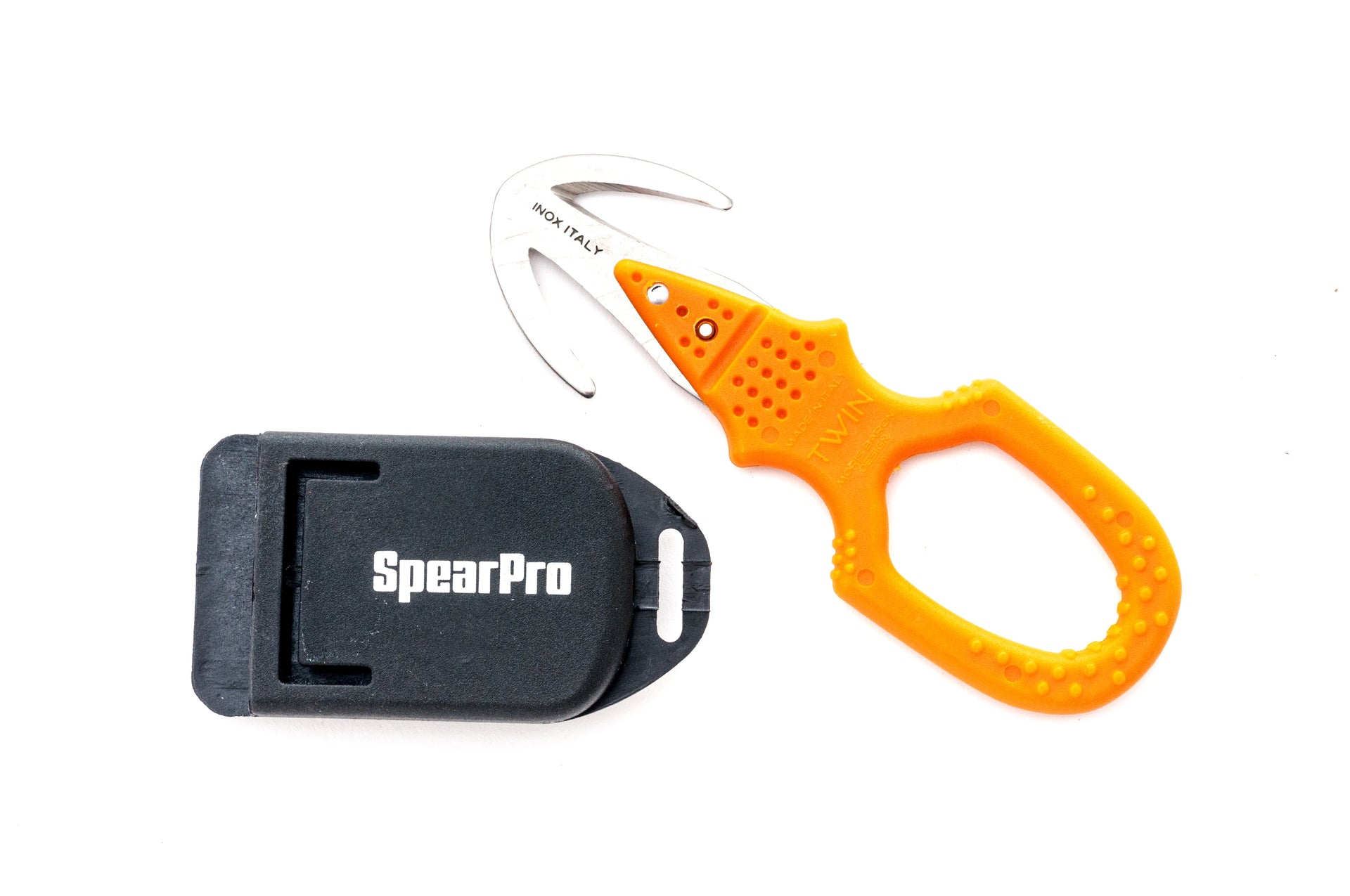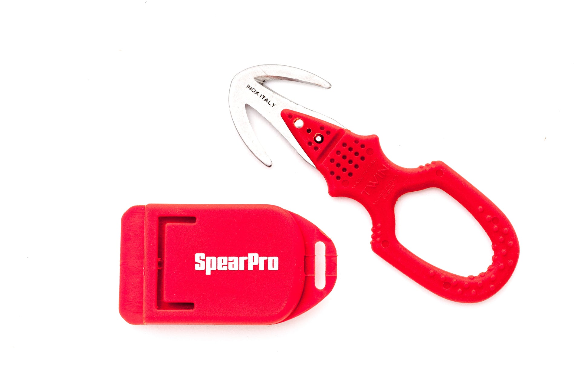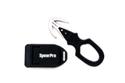 The SpearPro Twin Line Cutter is a twin safety blade line cutter with a hard plastic protective sheath that can be mounted onto 50 mm (2 inch) webbing.